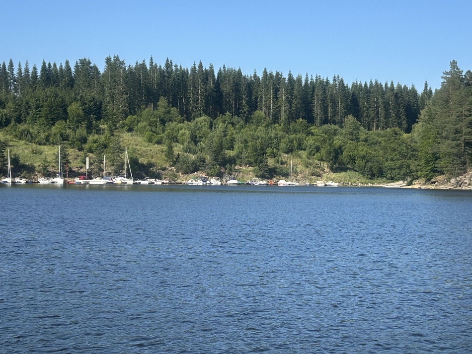14 km - Blick in der öffnenden großen Arena auf den Wendepunkt, links befindet sich der Campingplatz und rechts dieser Bootsanlegestelle ist der Wendepunkt in der Bucht mit Verpflegung und verpflichtender Meldug beim Posten.